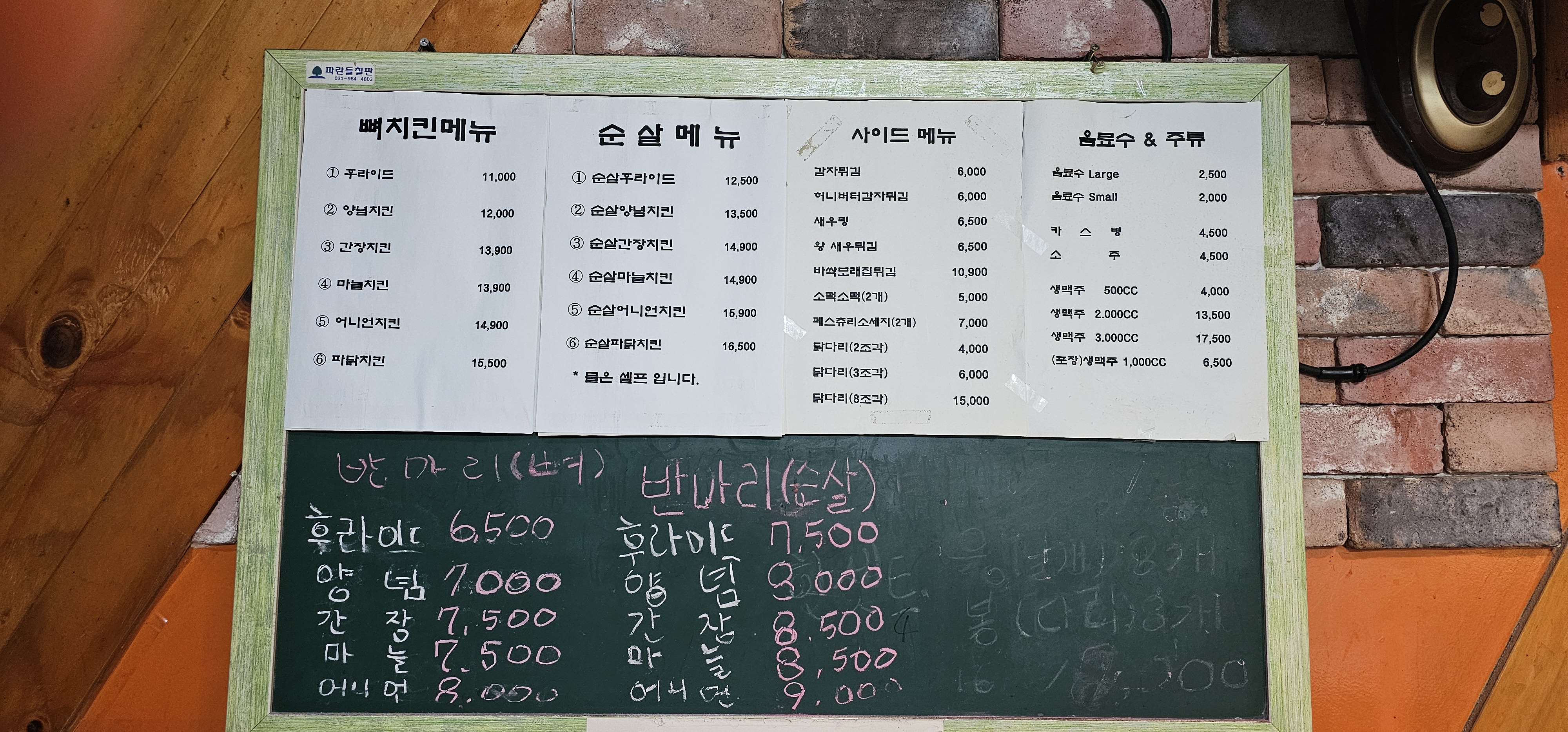 모든메뉴 순살 가능(포장가격) 1,500 | 뼈 파닭치킨 15,500 | 뼈 칠리치킨 15,500 | 뼈 어니언치킨 14,900 | 뼈 마늘치킨 13,900 | 뼈 간장치킨 13,900 | 뼈 양념치킨 12,000 | 뼈 크리스피후라이드 11,000