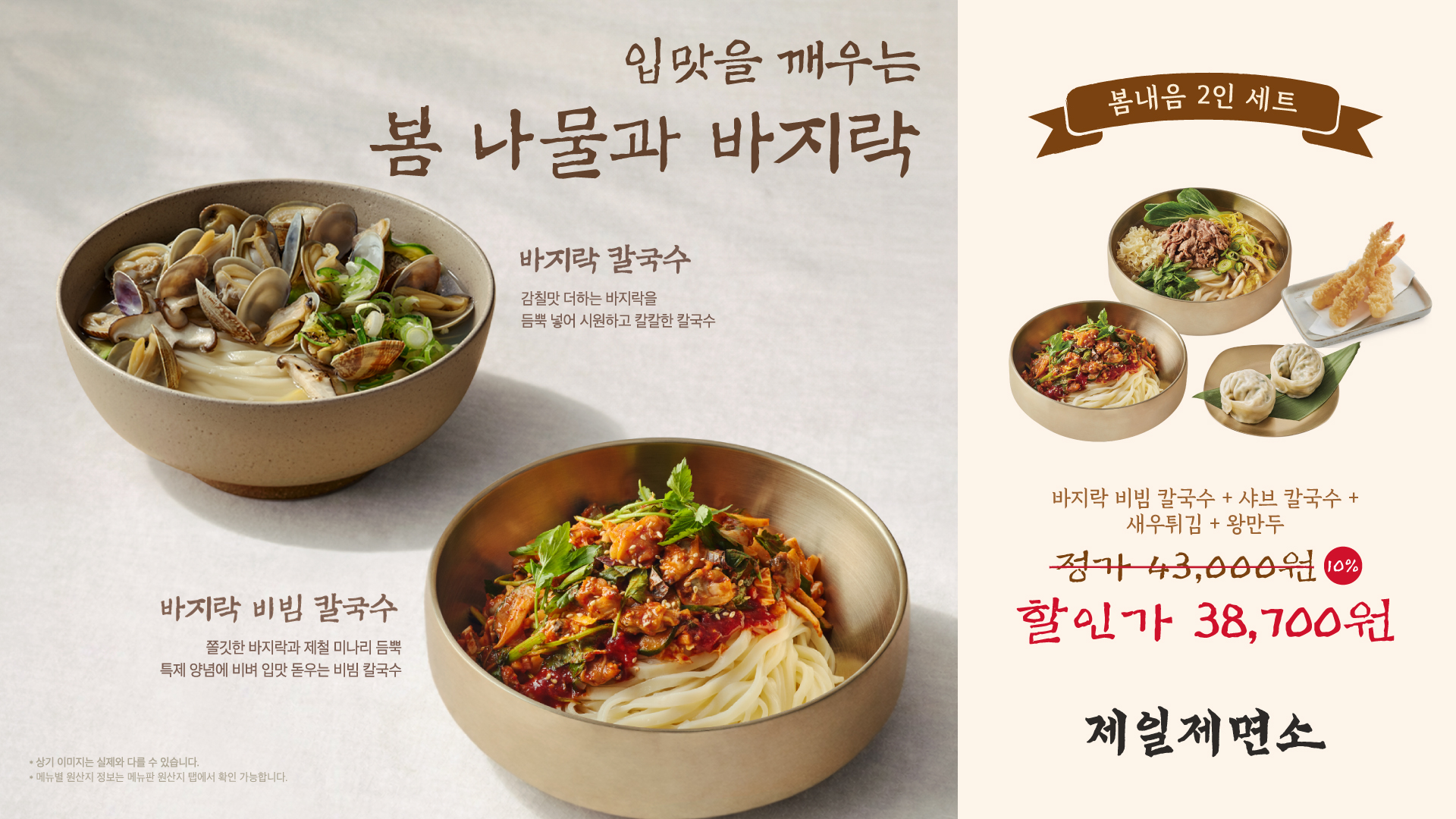봄내음 2인세트 38,700 | 바지락 비빔칼국수 차림상 17,000 | 바지락 비빔칼국수 13,000 | 명란 치즈 감자전 18,000 | 제일닭강정(大) 18,000 | 제일닭강정(小) 6,000 | 매운 낙지 비빔칼국수 13,000 | 매운 낙지 비빔밥 13,000 | 바지락 칼국수 12,000 | 제일 샤브국수 13,000 | 얼큰 샤브국수 13,000 | 제일 돈까스 13,000 | 불고기비빔밥(고추장) 12,000 | 불고기비빔밥(간장) 12,000 | 진한 들기름막국수 11,500